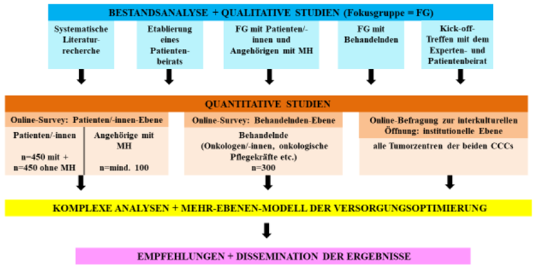 Zu Beginn erfolgt eine umfangreiche Literaturrecherche zu Zugangsbarrieren sowie ungedeckten Bedarfen in der (psycho-)onkologischen oder palliativmedizinischen Versorgung von onkologischen Patient:innen mit Migrationshintergrund. Ergänzend werden Fokusgruppen mit onkologischen Patient:innen mit Migrationshintergrund, deren Angehörigen sowie im onkologischen Bereich tätigen Behandelnden durchgeführt werden.